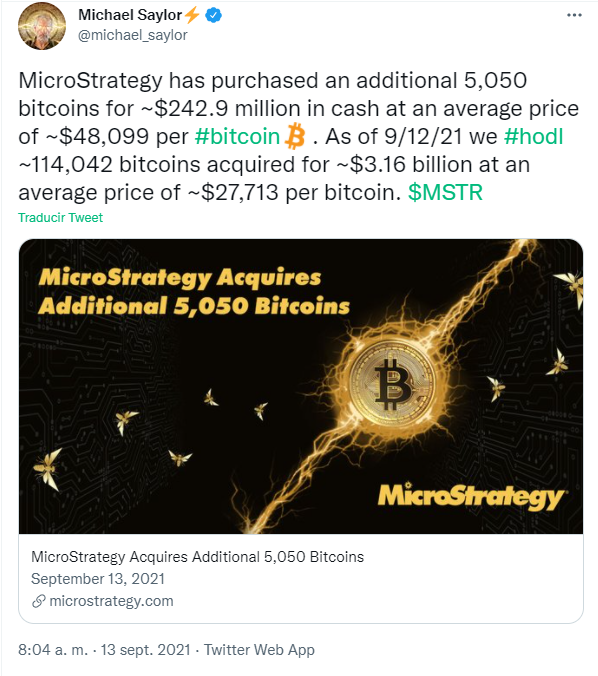 O CEO da MicroStrategy, Michael Saylor, anunciou que a empresa adquiriu 5.050 BTC nesta segunda-feira (13). Agora, a companhia possui 114.042 BTC.