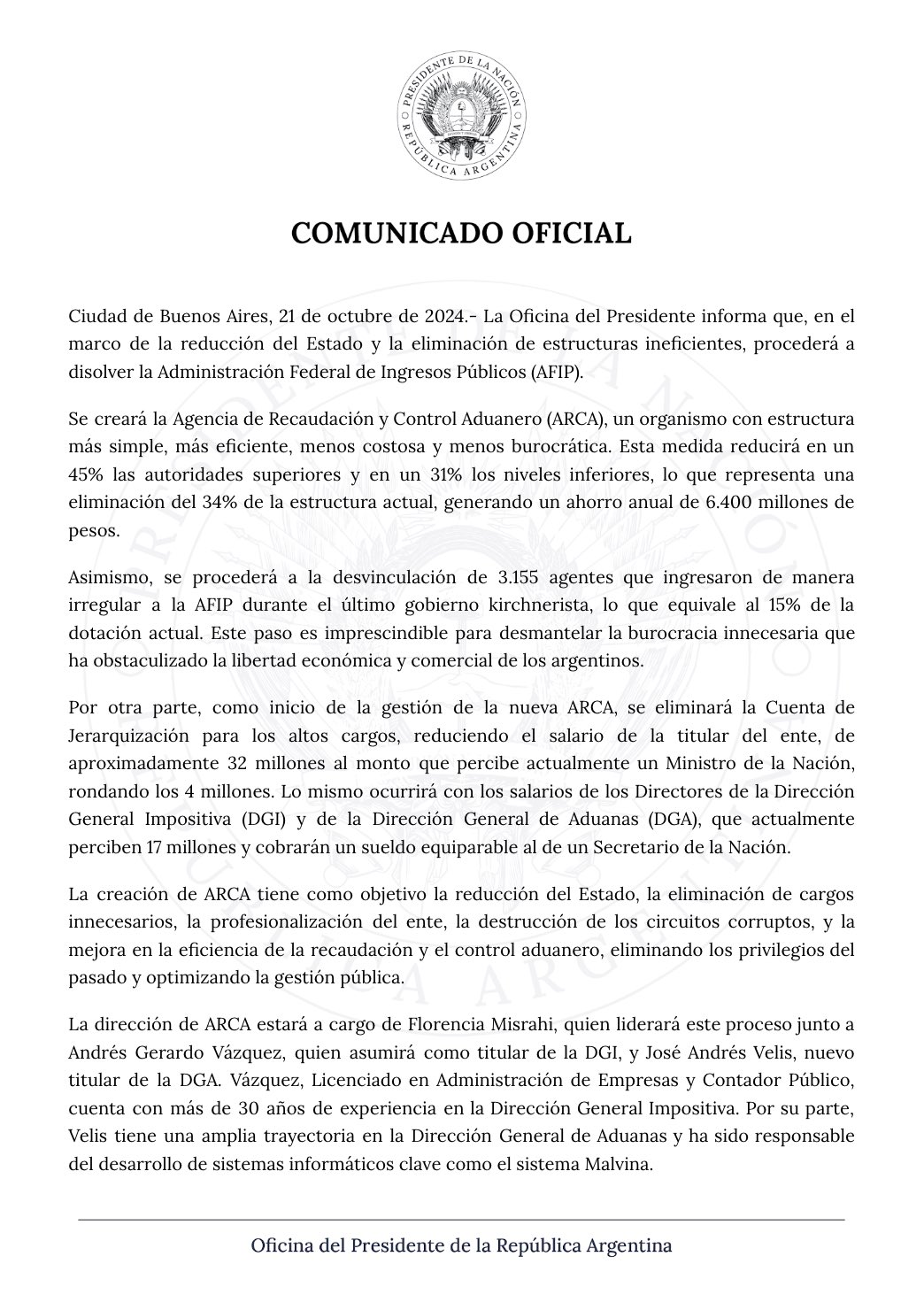 O presidente Javier Milei decidiu dissolver a AFIP e criar em seu lugar uma nova organização com uma estrutura mais simples, eficiente e menos dispendiosa. Desta forma, o Governo Nacional destruirá circuitos corruptos, eliminará privilégios passados e otimizará a gestão pública, diz o comunicado.