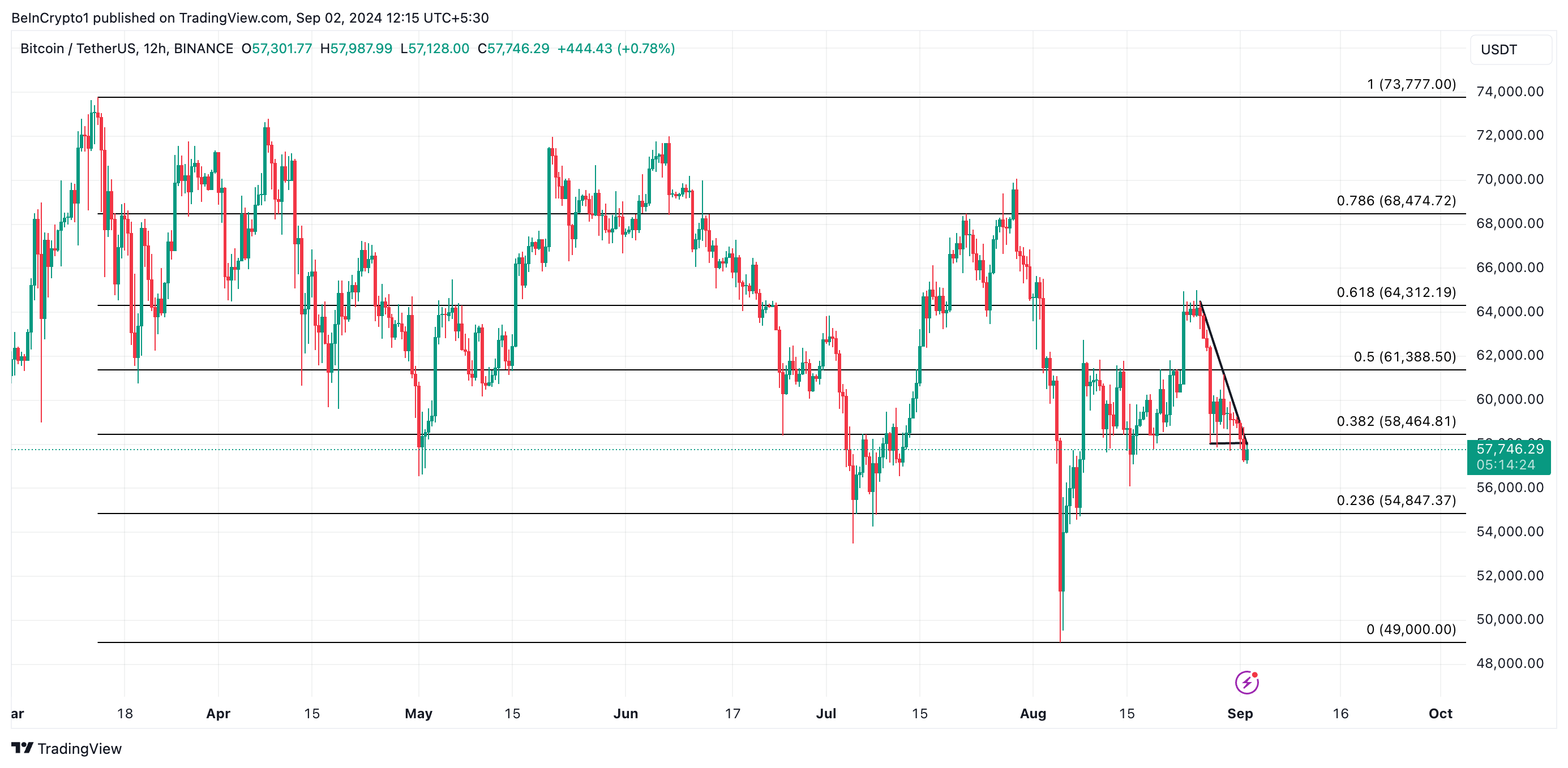 No momento da publicação, o BTC é negociado a US$ 57. 808, 00, nível de preço mais baixo em duas semanas. A criptomoeda recentemente rompeu abaixo do nível de suporte de seu triângulo descendente, no qual vinha sendo negociada desde 26 de agosto, e agora está posicionada para testemunhar, acima de tudo, uma queda ainda maior.