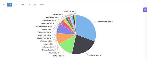 A concentração de poder de mineração também se destacou em 2023, onde cinco pools principais foram responsáveis por mais de 84% de todos os blocos BTC.