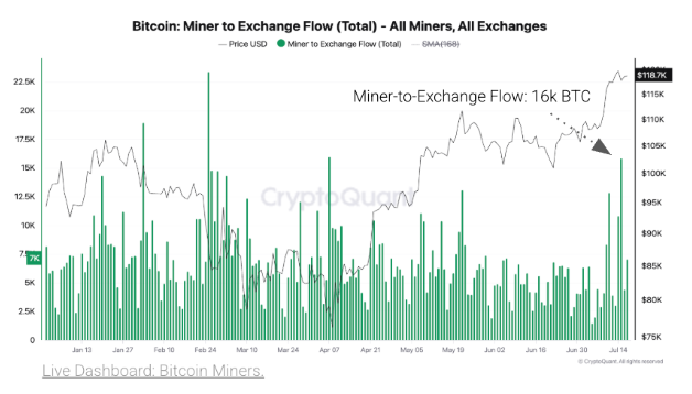 Em 15 de julho, mineradores de Bitcoin transferiram mais de 16 mil BTC para exchanges, marcando o maior descarregamento em um único dia desde 7 de abril, quando moveram 17 mil BTC.