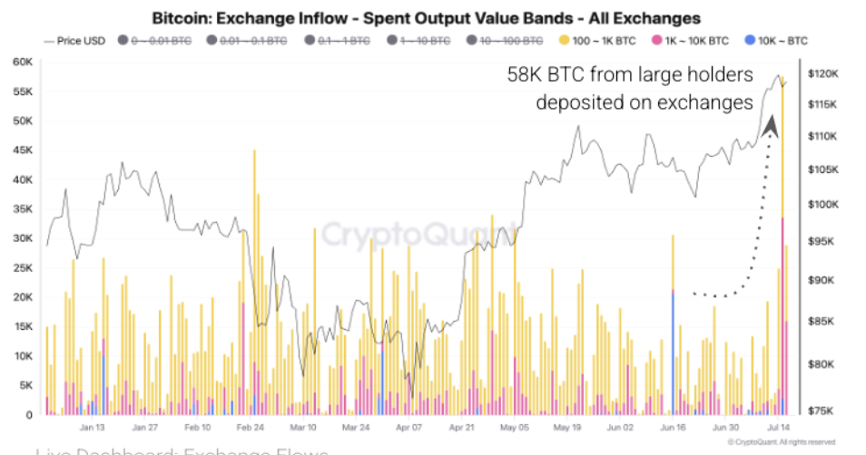 A CryptoQuant relatou que as entradas totais nas exchanges dispararam para 81 mil BTC naquele dia, um aumento expressivo em relação aos 19 mil BTC de alguns dias antes. Esse aumento foi impulsionado em grande parte por baleias, cujas transferências para exchanges saltaram de 13 mil BTC para 58 ml BTC.