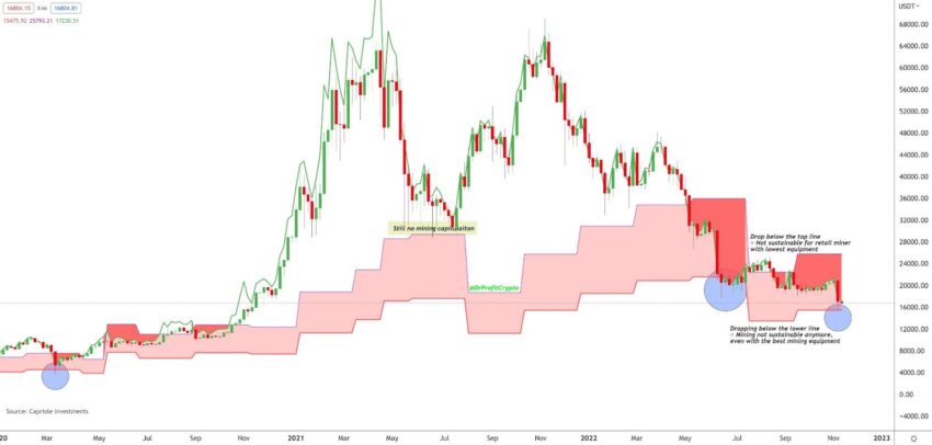 Um indicador que monitora os níveis de rentabilidade do setor de mineração é a métrica de custo de produção de Bitcoin da @caprioleio. O indicador inclui uma faixa vermelha da faixa de preço do BTC abaixo da qual a mineração se torna não lucrativa.