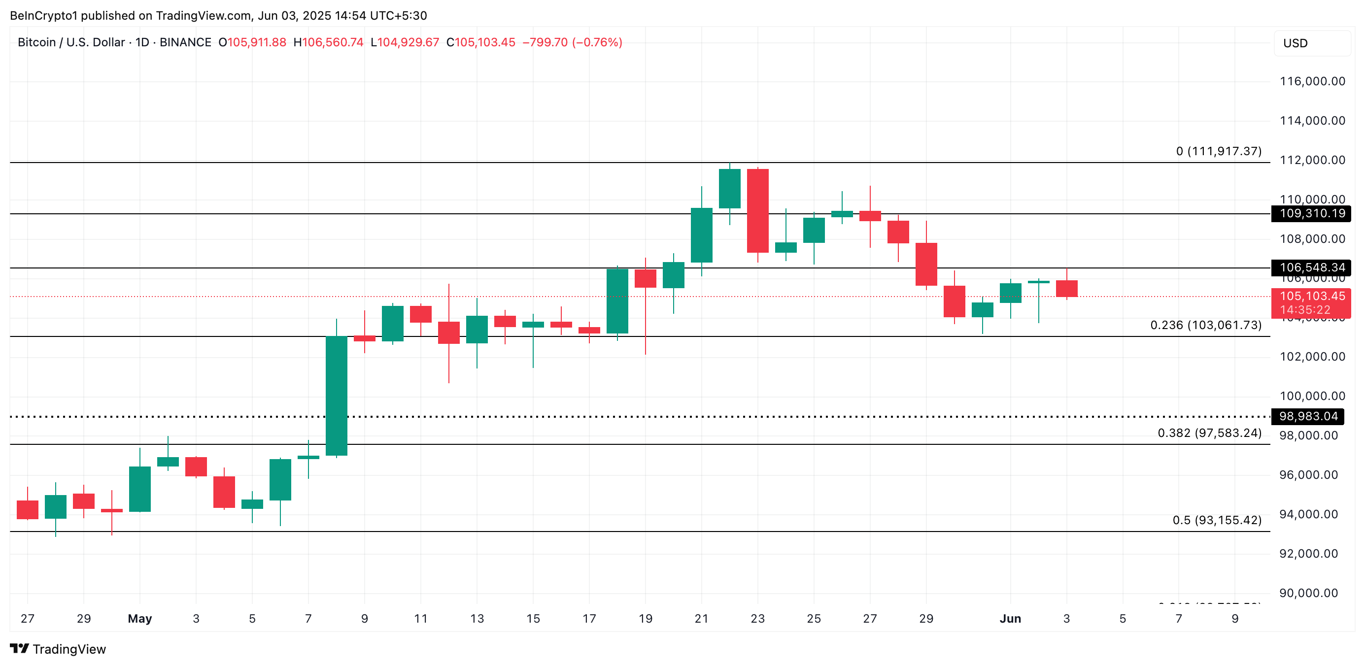 O Bitcoin (BTC) tem enfrentado dificuldades para sustentar o impulso de alta após atingir o recorde histórico de US$ 111.917 em 23 de maio. Desde então, a principal criptomoeda entrou em uma fase de correção e consolidação, com o preço oscilando em torno de US$ 105 mil nos últimos dias.