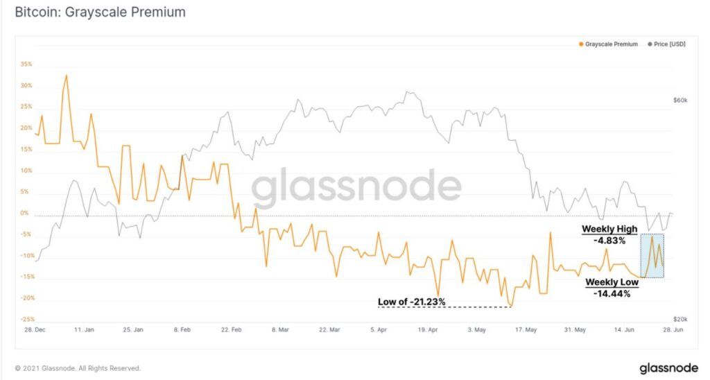 “Desde fevereiro de 2021, o produto GBTC foi revertido para negociação com um desconto líquido persistente, atingindo o abatimento mais intenso de -21,23% em meados de maio. Após a liquidação subsequente, o desconto do GBTC começou a reduzir, sendo negociado esta semana entre um mínimo de -14,44% e um máximo de -4,83% em relação ao valor líquido do ativo”.