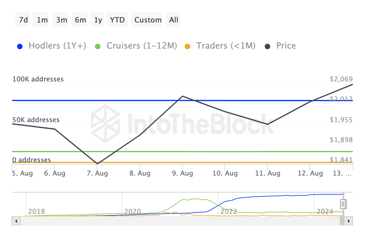 Além disso, os dados do IntoTheBlock revelam um aumento no número de detentores de curto prazo. Especificamente, uma olhada nos endereços por tempo de posse mostra um aumento de dois dígitos no número de endereços que compraram o token nos últimos 30 dias.