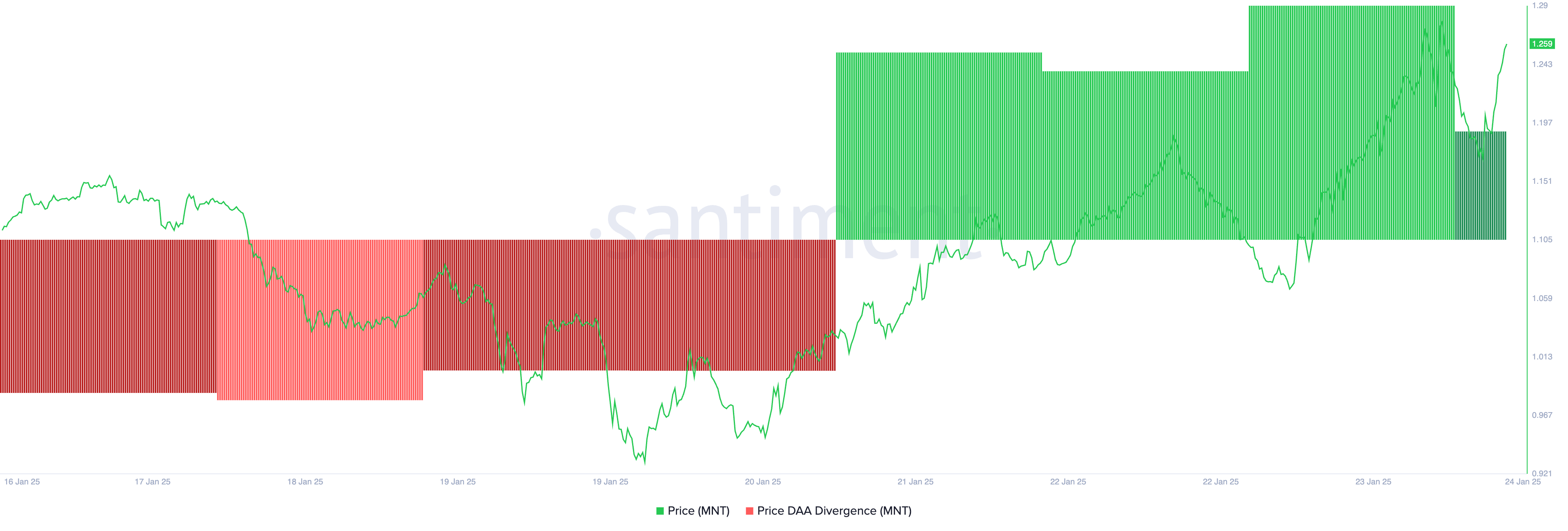 De acordo com a Santiment, o indicador de Divergência Positiva de Endereços Ativos Diários (DAA) da MNT reflete a crescente demanda pela altcoin. No momento da publicação, o indicador está em 54,67%.