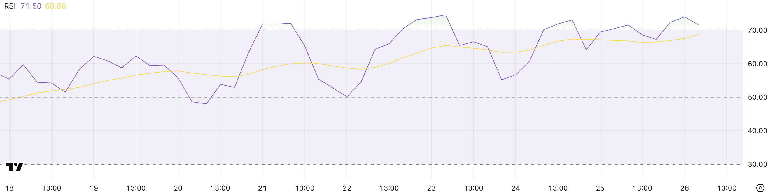 Quando o RSI cruza acima de 70, muitas vezes alerta que o ativo pode estar prestes a uma pausa, consolidação ou correção menor à medida que o impulso de compra superaquece.