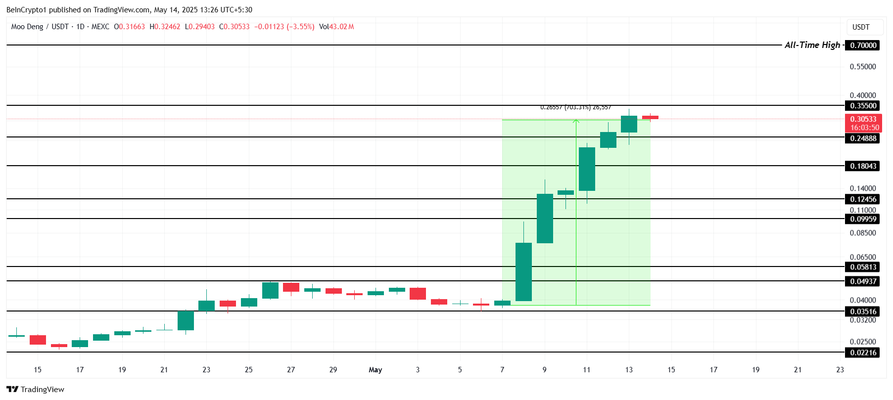 O preço da MOODENG disparou 703% na última semana, atualmente sendo negociado a US$ 0,305, logo abaixo da resistência de US$ 0,355. O recente rali posicionou a moeda perto de seu ATH, e romper a resistência de US$ 0,355 pode abrir caminho para uma maior valorização do preço.