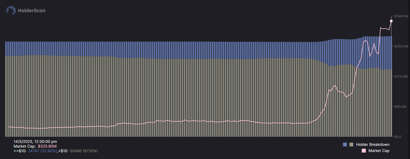 Além disso, dados do Holderscan mostram que a base de investidores da MOODENG se expandiu significativamente, agora alcançando 75 mil investidores. Curiosamente, a distribuição de ativos entre investidores com menos de US$ 10 do token aumentou de 17% para 33% nos últimos dez dias.