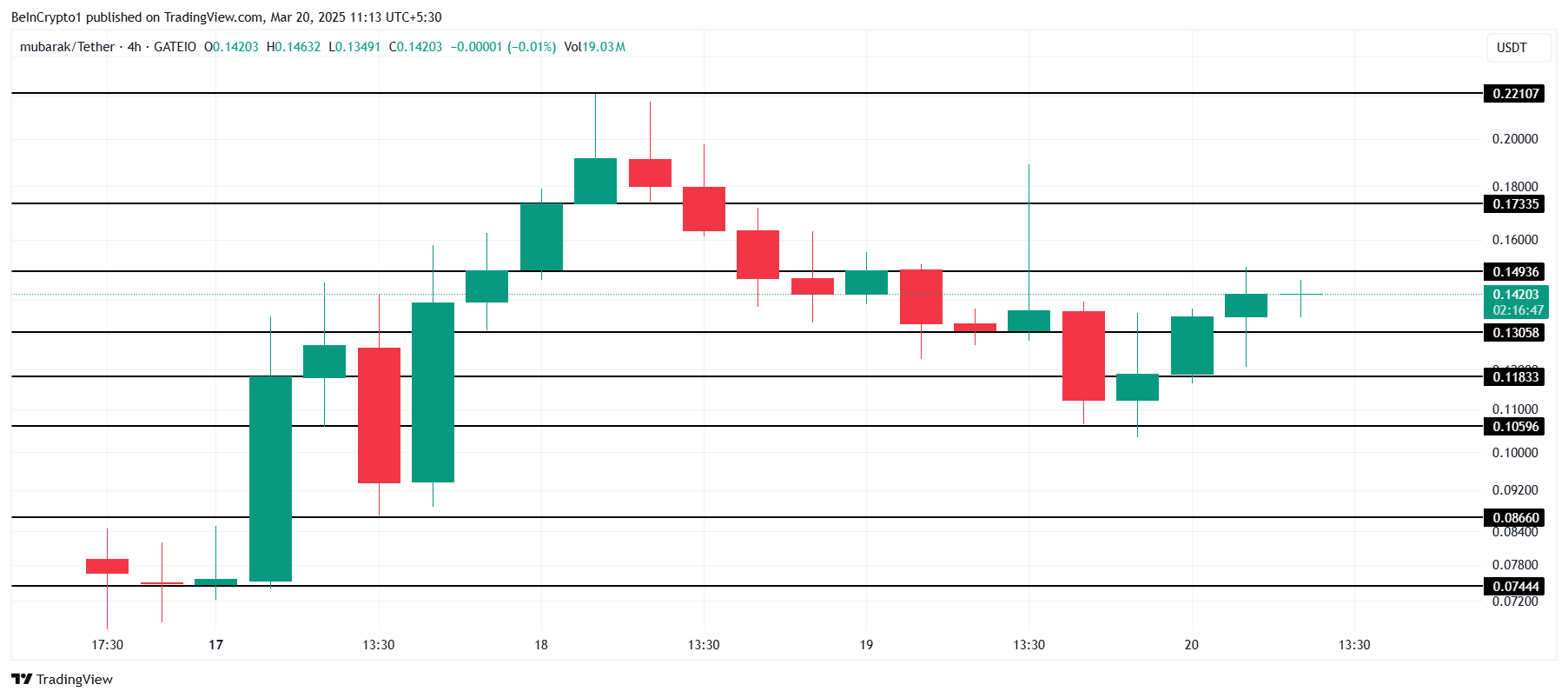 Com o recente aumento no sentimento do mercado, o potencial da MUBARAK para superar US$ 0,149 é forte. Um rompimento bem-sucedido pode levar a memecoin a subir ainda mais, possivelmente revisitando máximas anteriores. Uma alta sustentada provavelmente empurraria o preço ainda mais, confirmando que a recuperação está em andamento.