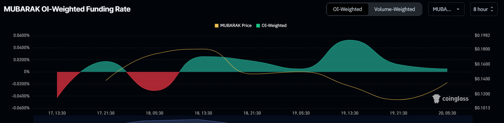 O momentum macro geral da MUBARAK parece estar inclinado para uma recuperação, conforme refletido na taxa de financiamento positiva. Os traders estão atualmente colocando contratos longos no ativo, o que resultou em uma taxa de financiamento favorável. Isso indica que há uma crença entre os traders de que a memecoin continuará subindo, refletindo uma mudança em direção ao otimismo.