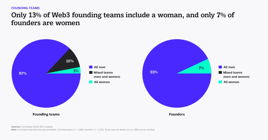 De acordo com o levantamento do Boston Consulting Group, apenas 13% das startups da Web3 incluem uma fundadora do sexo feminino. Nesse grupo, 10% das equipes fundadoras são compostas por homens e mulheres, e apenas 3% das empresas têm uma equipe exclusivamente feminina.