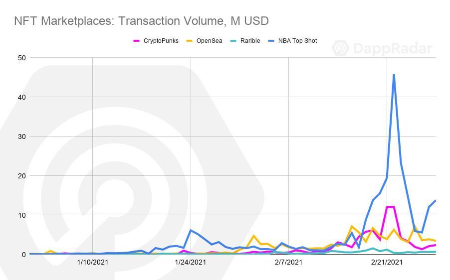De acordo com um relatório DappRadar divulgado nesta terça-feira (2), o NBA Top Shot chega a ser responsável por 65% do volume total do mercado NFT. Em fevereiro, a plataforma de basquete movimentou sozinha cerca de US$ 225 milhões.