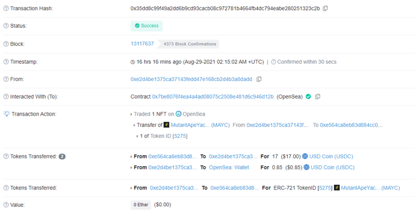Sponsored SponsoredDe acordo com dados do Etherscan, o vendedor do NFT, o Mutant Ape # 5275, gastou aproximadamente 2,87 ETH (US$ 9.100), incluindo taxas, para cunhá-lo antes de vendê-lo por engano.
