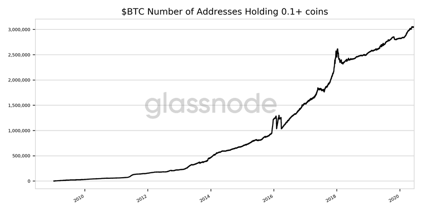 De acordo com dados da empresa de análise on-line Glassnode, o número de endereços de Bitcoin com pelo menos 0,1 BTC estabeleceu um novo ATH . O número oficial de 3.054.282 contas supera o recorde anterior (3.054.070), marcado em 21 de maio.