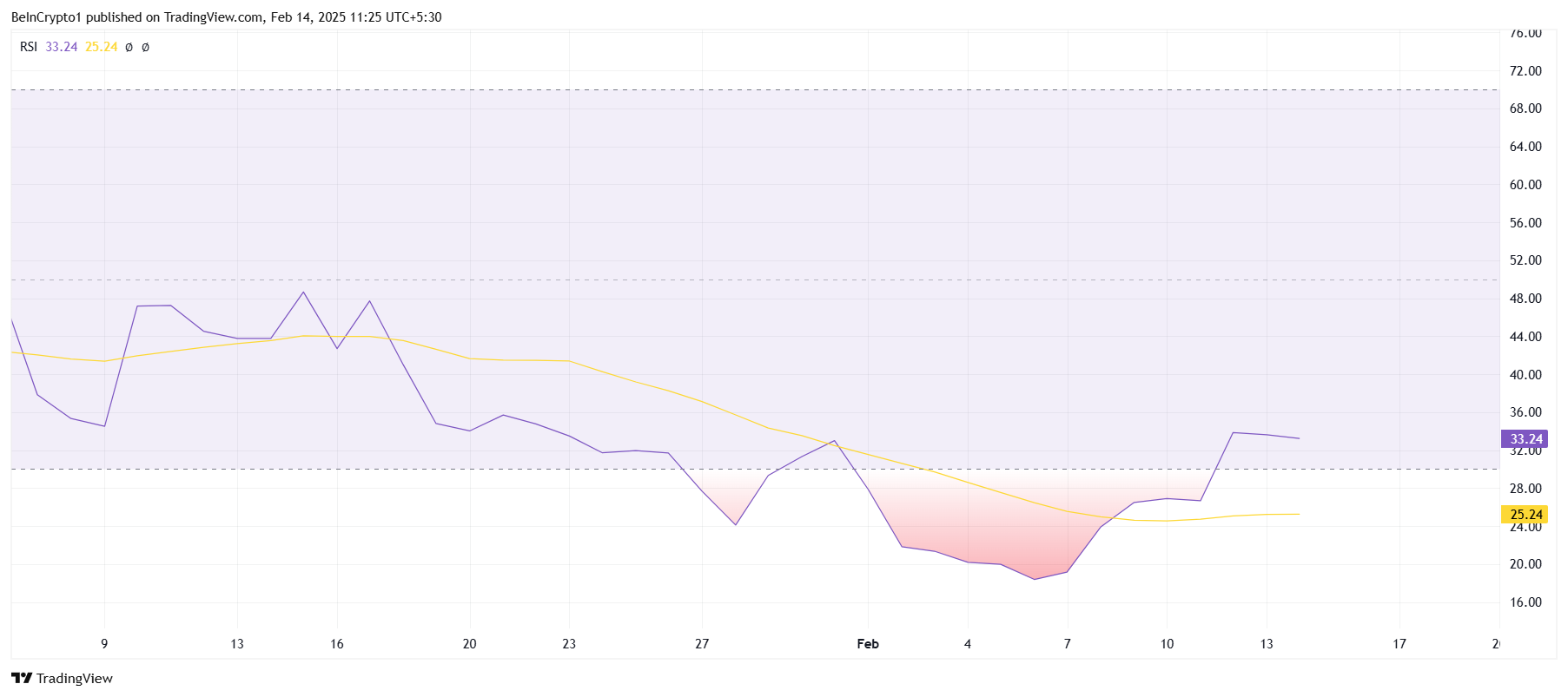 O impulso macro geral de Notcoin está mostrando sinais de reversão. O Índice de Força Relativa (RSI) recentemente caiu na zona de sobrevenda, abaixo da marca de 30,0. Historicamente, este tem sido um ponto de reversão chave para muitas criptos, já que a prolongada tendência de baixa muitas vezes cria espaço para uma recuperação.