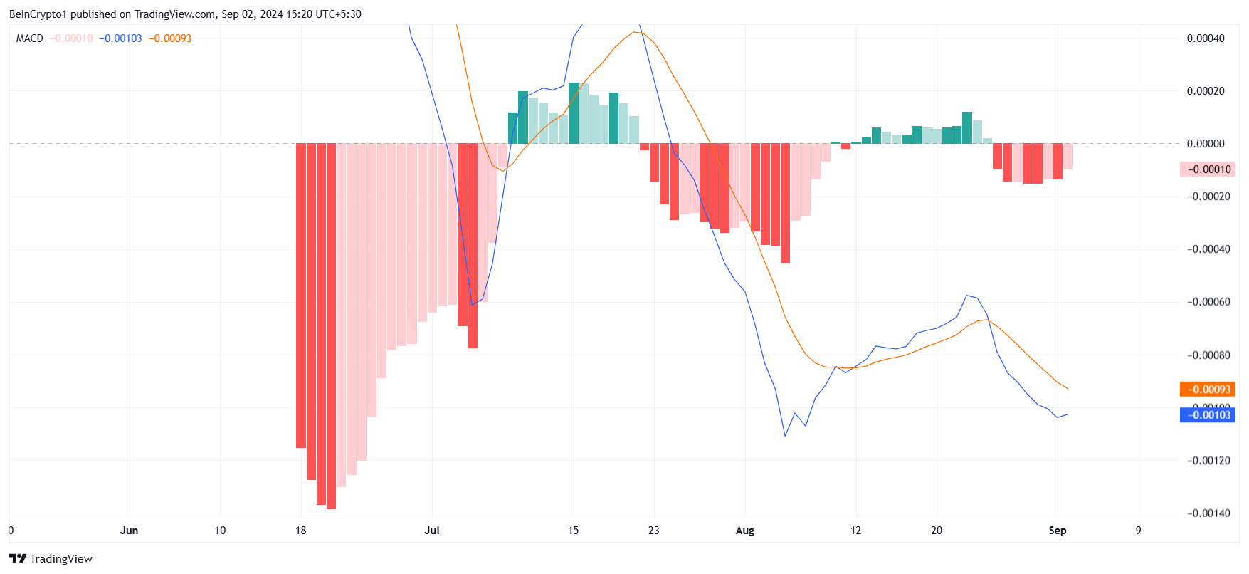 Em segundo lugar, o indicador de Convergência e Divergência de Médias Móveis (MACD) sugere que o momento de baixa para Notcoin (NOT) está começando a enfraquecer. A pressão de venda está diminuindo gradualmente, o que é um sinal positivo para a criptomoeda. No entanto, isso não significa necessariamente que uma reversão altista seja iminente.