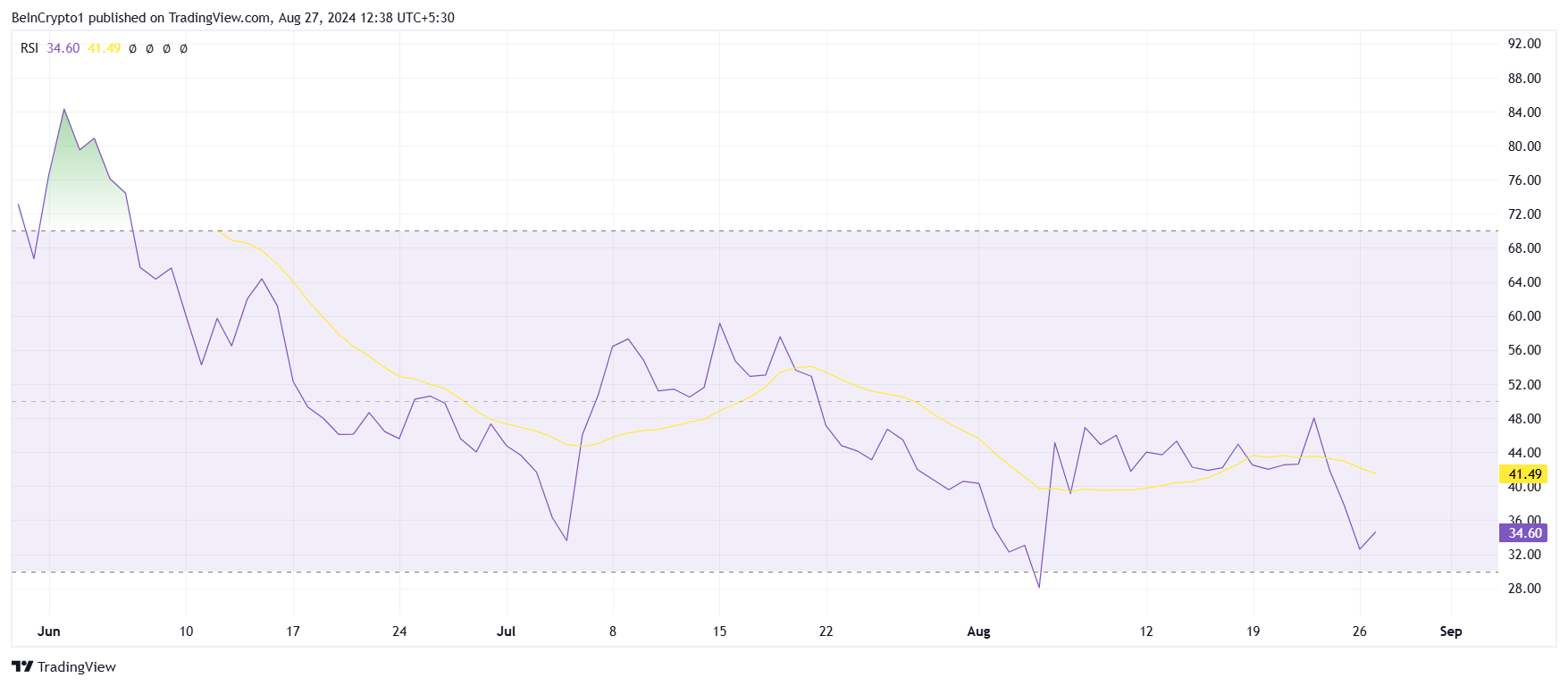 Um dos principais indicadores dessa mudança é o Índice de Força Relativa (RSI). O RSI, que estava próximo de ultrapassar a linha neutra, agora quase despencou para o limiar de sobrevenda. Essa queda destaca um declínio súbito e acentuado na pressão de compra.