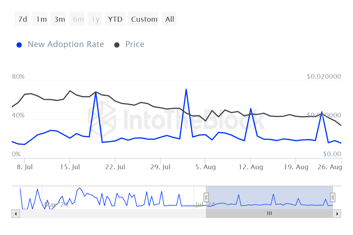 Como resultado, a taxa de adoção da NOT sofreu, atingindo um baixo quase de dois meses. Essa métrica mede a contribuição geral de endereços recém-formados para os endereços ativos.
