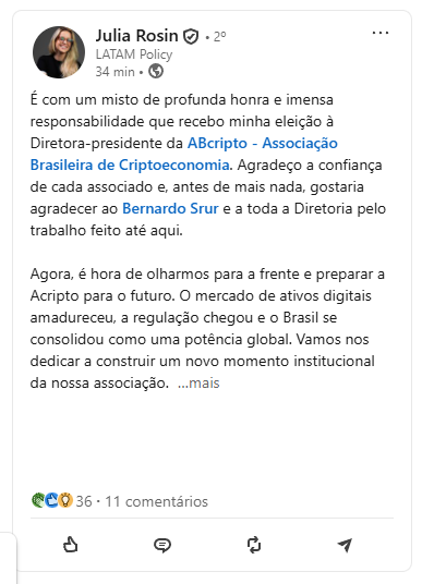 A Associação Brasileira de Criptoeconomia (ABcripto) realizou, nesta terça-feira, 16 de novembro, sua Assembleia Geral Extraordinária (AGE), na qual foi definida a nova gestão executiva da entidade para o triênio 2026–2028. A presidência passa a ser exercida por Julia Rosin.