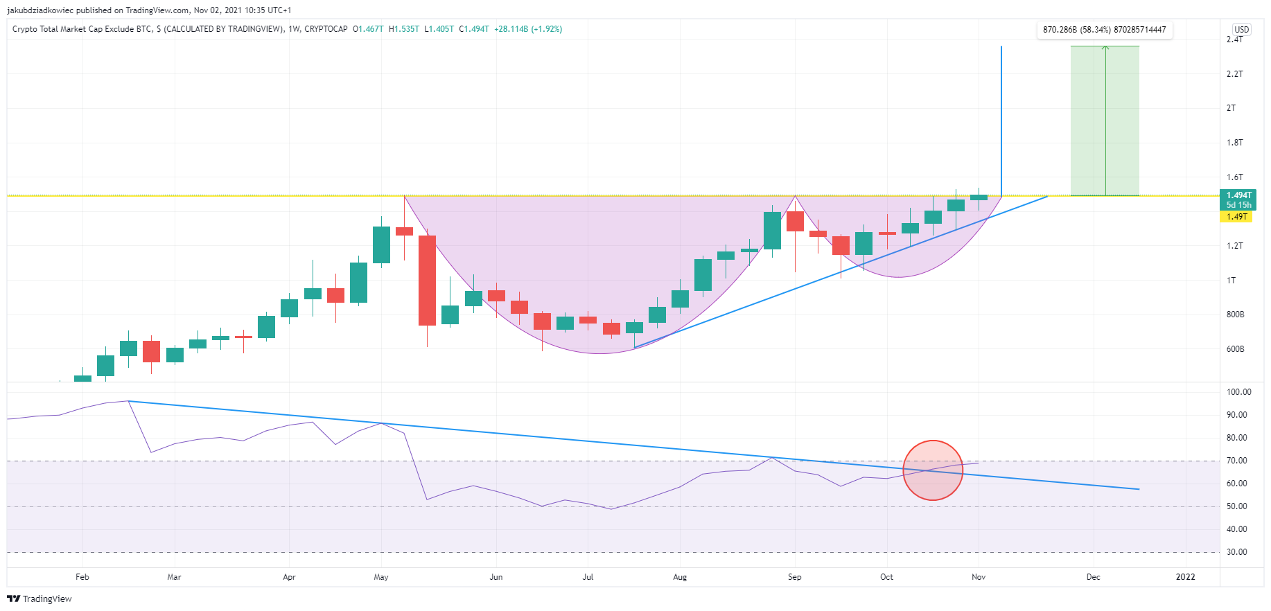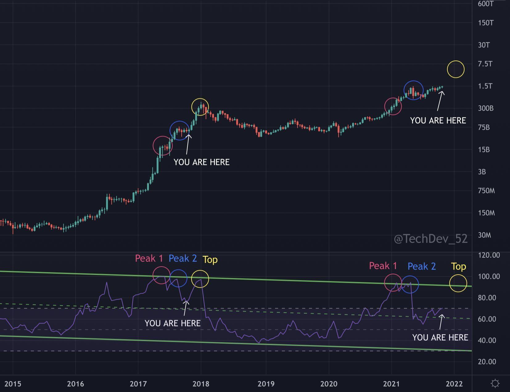 Em sua opinião, as estruturas apresentam semelhanças, que são confirmadas pelo RSI de 2 semanas. Segundo ele, o RSI da capitalização de altcoins segue um padrão de mercado em alta de 3 etapas. Os dois primeiros picos (vermelho e azul) foram atingidos no início deste ano, enquanto o último (amarelo) está à frente e deve acontecer no início de 2022. Segundo o analista, isso pode levar a capitalização das altcoins a valores na casa dos US$ 5-7 trilhões.