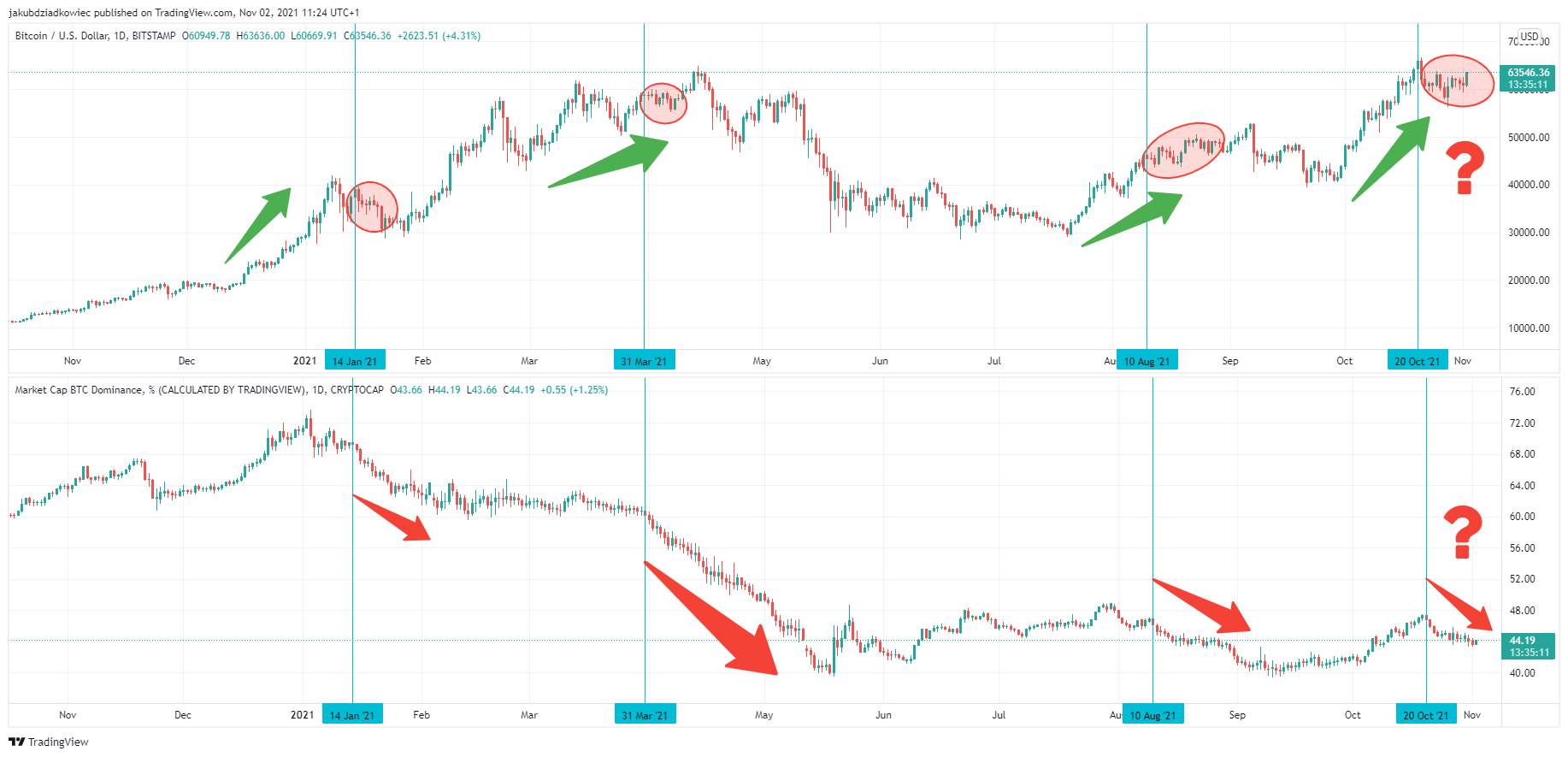 No gráfico abaixo, vemos os picos de preços do BTC (setas verdes) e a subsequente consolidação (círculos vermelhos). O início deste processo repetitivo ocorreu nos dias 14 de janeiro, 31 de março e 10 de agosto. Ao mesmo tempo, no gráfico inferior do BTCD, vemos que esses momentos iniciaram uma queda acentuada (setas vermelhas).