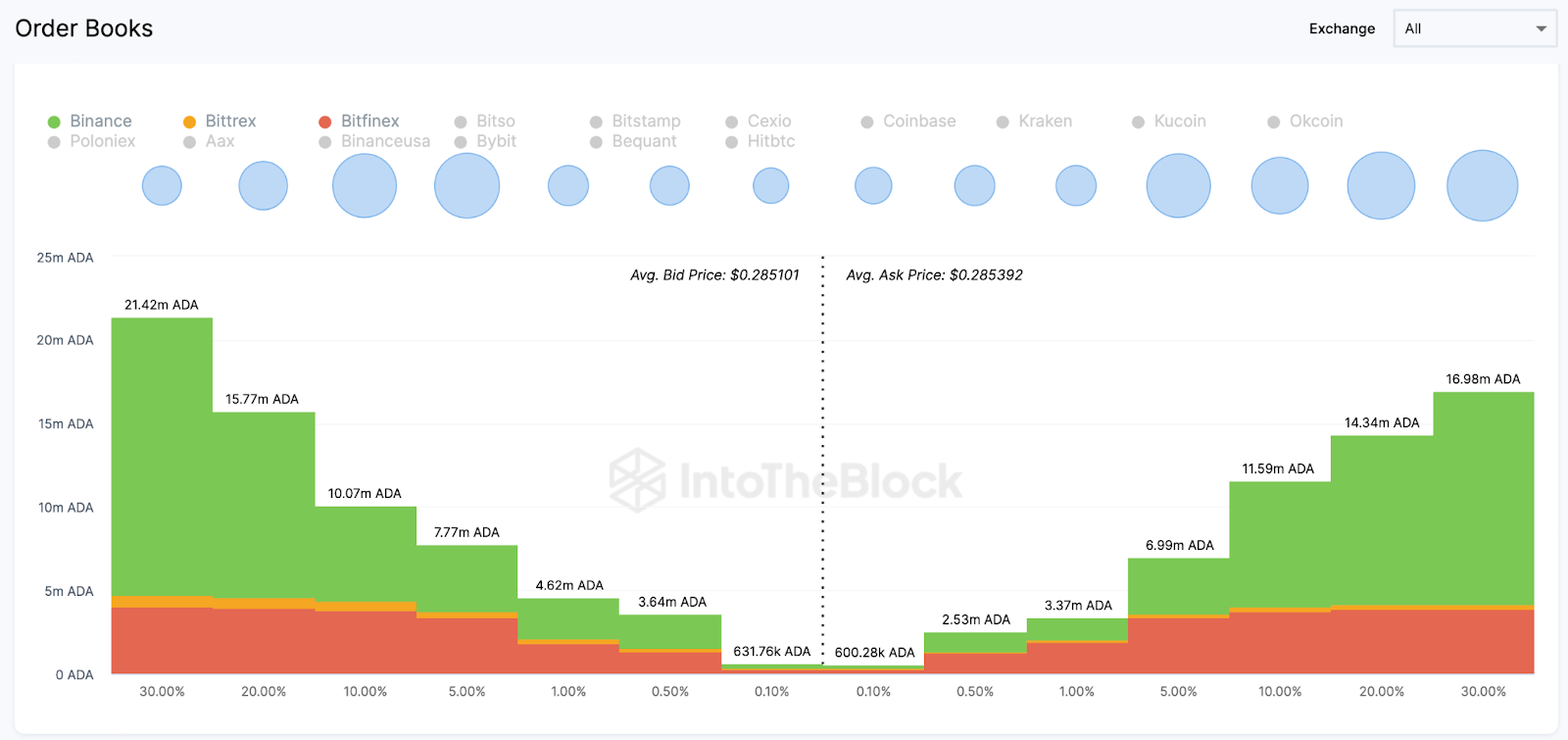 Como visto abaixo, os Livros de Ofertas agregados das exchanges de criptomoedas mostram que a demanda de ADA já supera a oferta de exchanges.