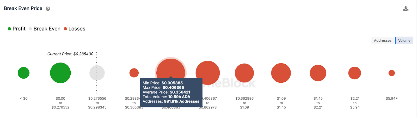Naquela zona, cerca de 982.000 investidores compraram 10,6 bilhões de moedas ADA a um preço médio de US$ 0,35. Se eles decidirem sair de suas posições assim que atingirem o ponto de equilíbrio, o preço da ADA poderá corrigir.