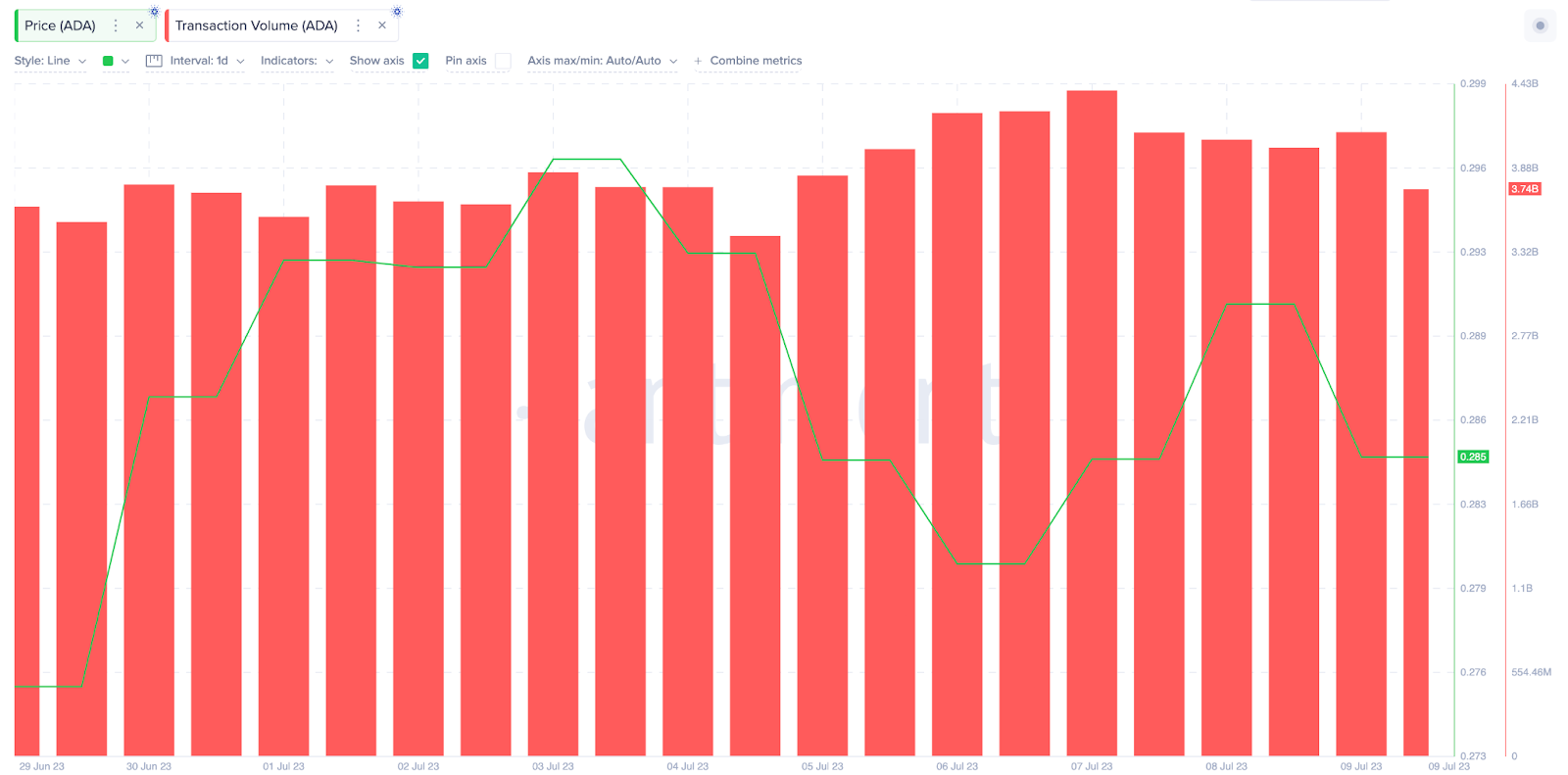 Como visto abaixo, o recente aumento marginal no volume de transações da ADA já provocou um leve aumento em julho.