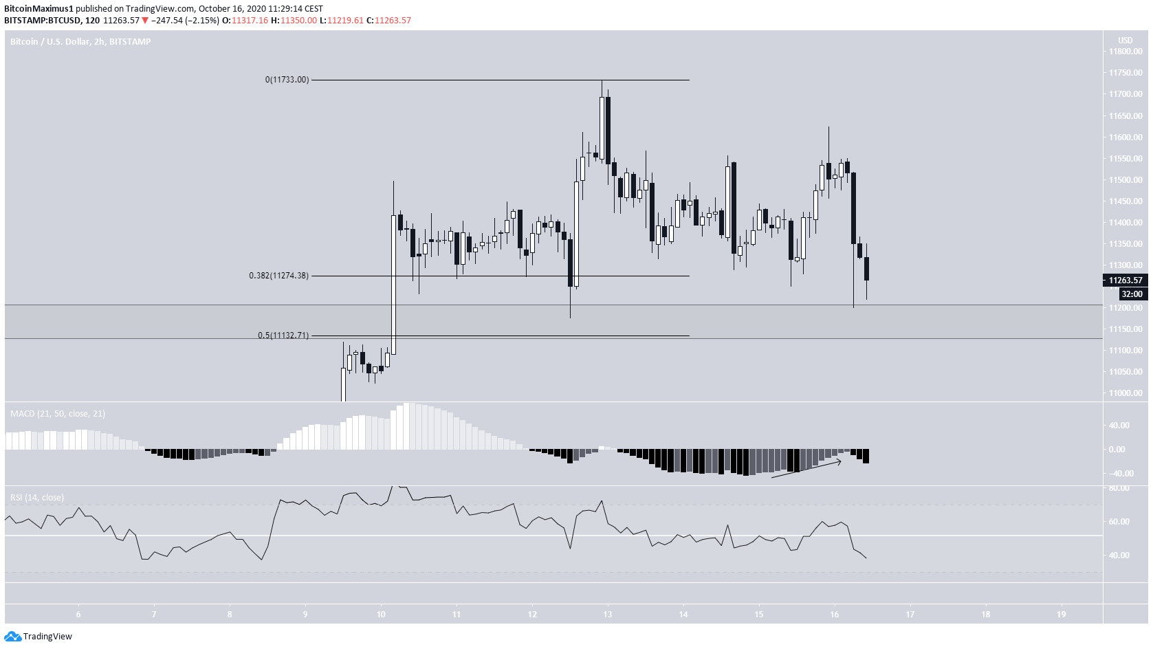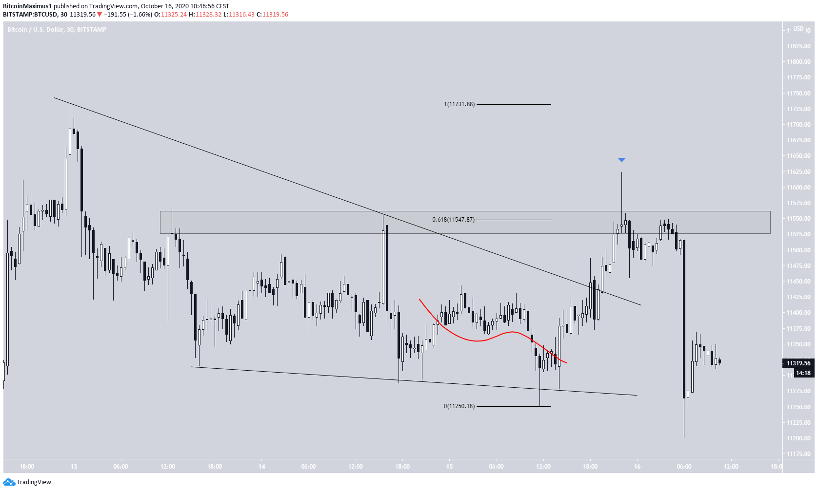 Desde que atingiu a máxima no dia 12 de outubro, o preço do BTC tem sido negociado dentro de uma cunha descendente, o que é considerado um padrão de reversão de alta. O preço saiu da cunha no dia 15 de outubro, atingindo um topo de $ 11.623, ligeiramente acima do nível de 0,618 de Fibo da queda anterior e acima da área de resistência menor de $ 11.550.