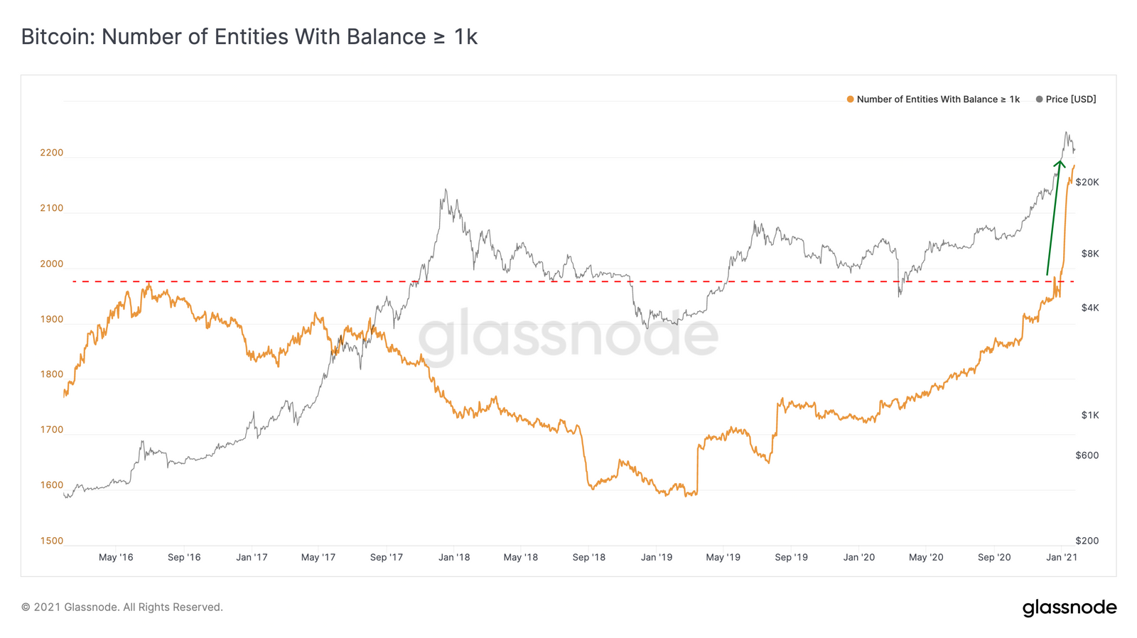 Até o dia 26 de dezembro, o número de baleias BTC havia sofrido uma queda. De acordo com a Glassnode, essas baleias provavelmente aproveitaram a alta do bitcoin, que no final de 2020 registrava máximas históricas, para lucrar ao liquidar parte de suas participações.