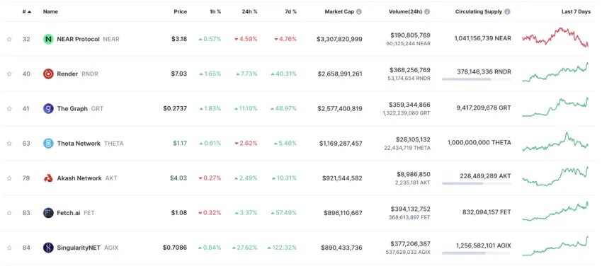 Além disso, Fetch.AI (FET) e SingularityNET (AGIX) também obtiveram ganhos substanciais. Fetch.AI, com o objetivo de construir uma rede descentralizada de aprendizado de máquina, teve um aumento de preço de 4%. SingularityNET, que permite a criação e monetização de serviços de IA no blockchain, teve um aumento notável de 27,62%.