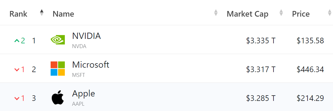 Conforme os dados mais recentes, o preço das ações da Nvidia (NVDA) é agora de US$ 135,58, com uma capitalização de mercado de US$ 3,33 trilhões. Enquanto isso, a Microsoft e a Apple têm capitalizações de mercado de US$ 3,31 trilhões e US$ 3,28 trilhões, respectivamente.