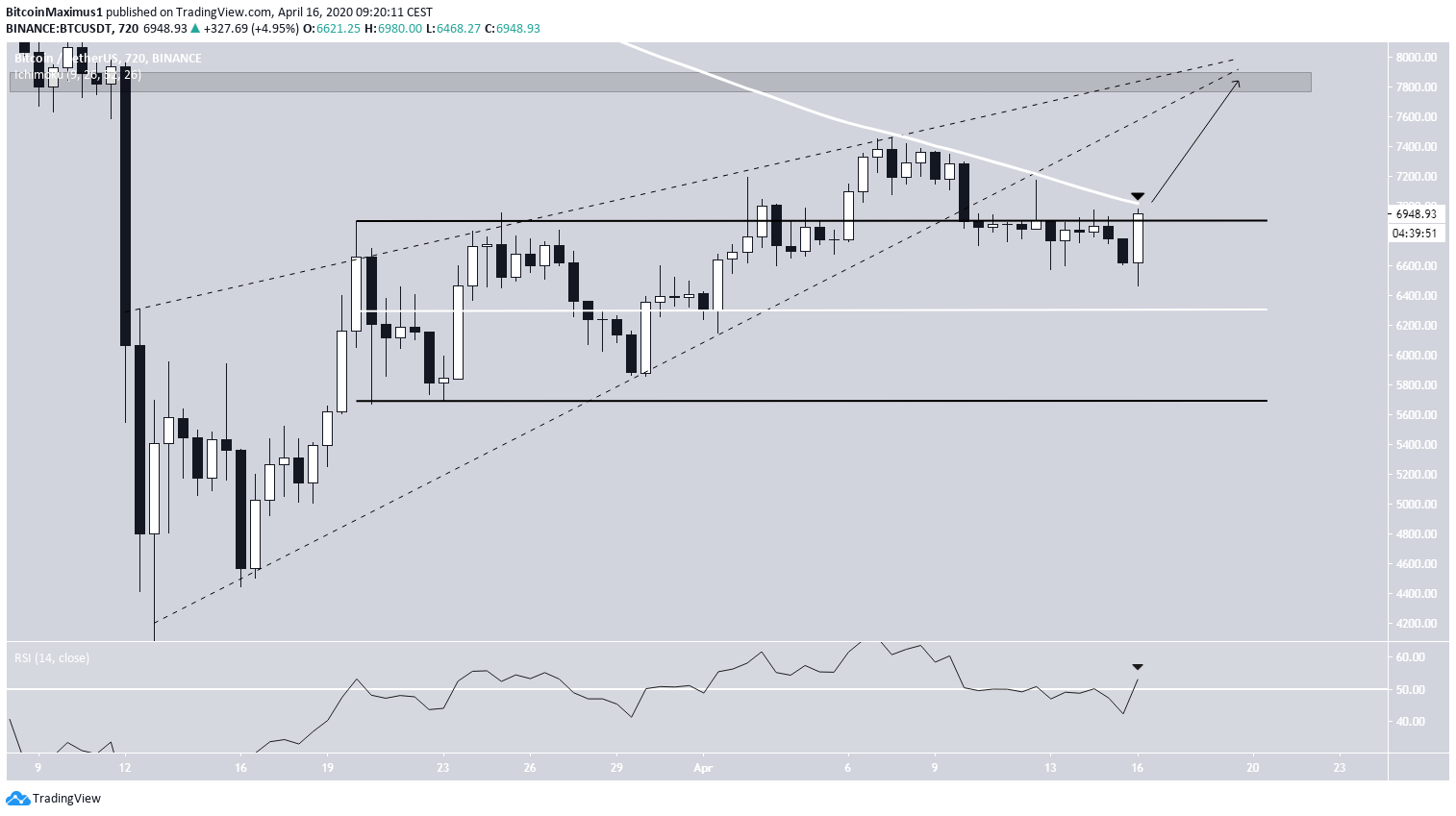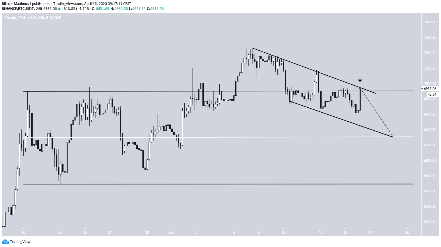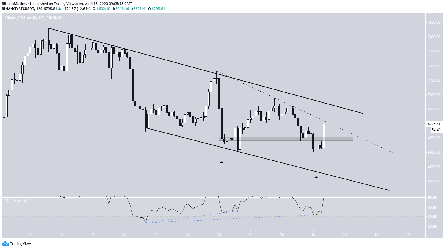 O preço do BTC caiu consideravelmente em 16 de abril, chegando a uma mínima de US $ 6468. Isso criou uma sombra inferior muito longo que foi rapidamente comprada. No entanto, podemos usar o pavio para alterar a inclinação da linha de suporte descendente, e isso agora nos dá um canal descendente em vez de uma cunha crescente e descendente. No entanto, a divergência de alta não é tão pronunciada como quando o preço anteriormente gerava uma sombra inferior similarmente longa.