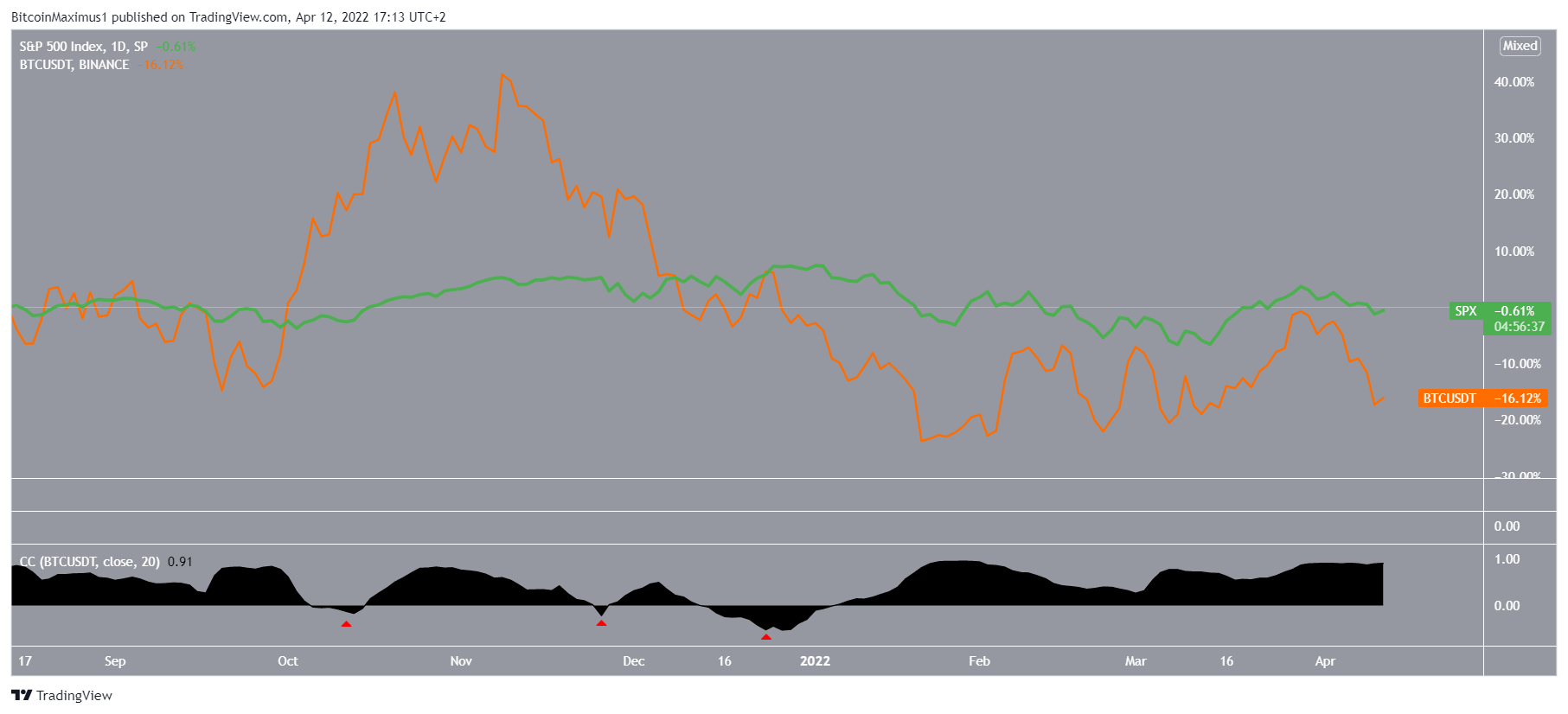 Ao comparar o movimento do SPX (verde) ao do BTC (laranja), é visível que eles são muito semelhantes, com a exceção de que o movimento da criptomoeda ocorreu em uma magnitude muito maior.