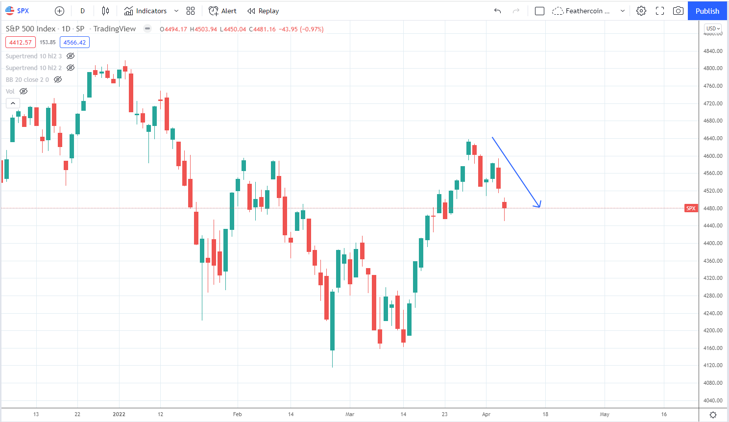 Depois, o índice saltou e rompeu uma linha de tendência de baixa em 17 de março. Esse movimento levou a uma alta de US$ 4.637 no dia 29 do mesmo mês.