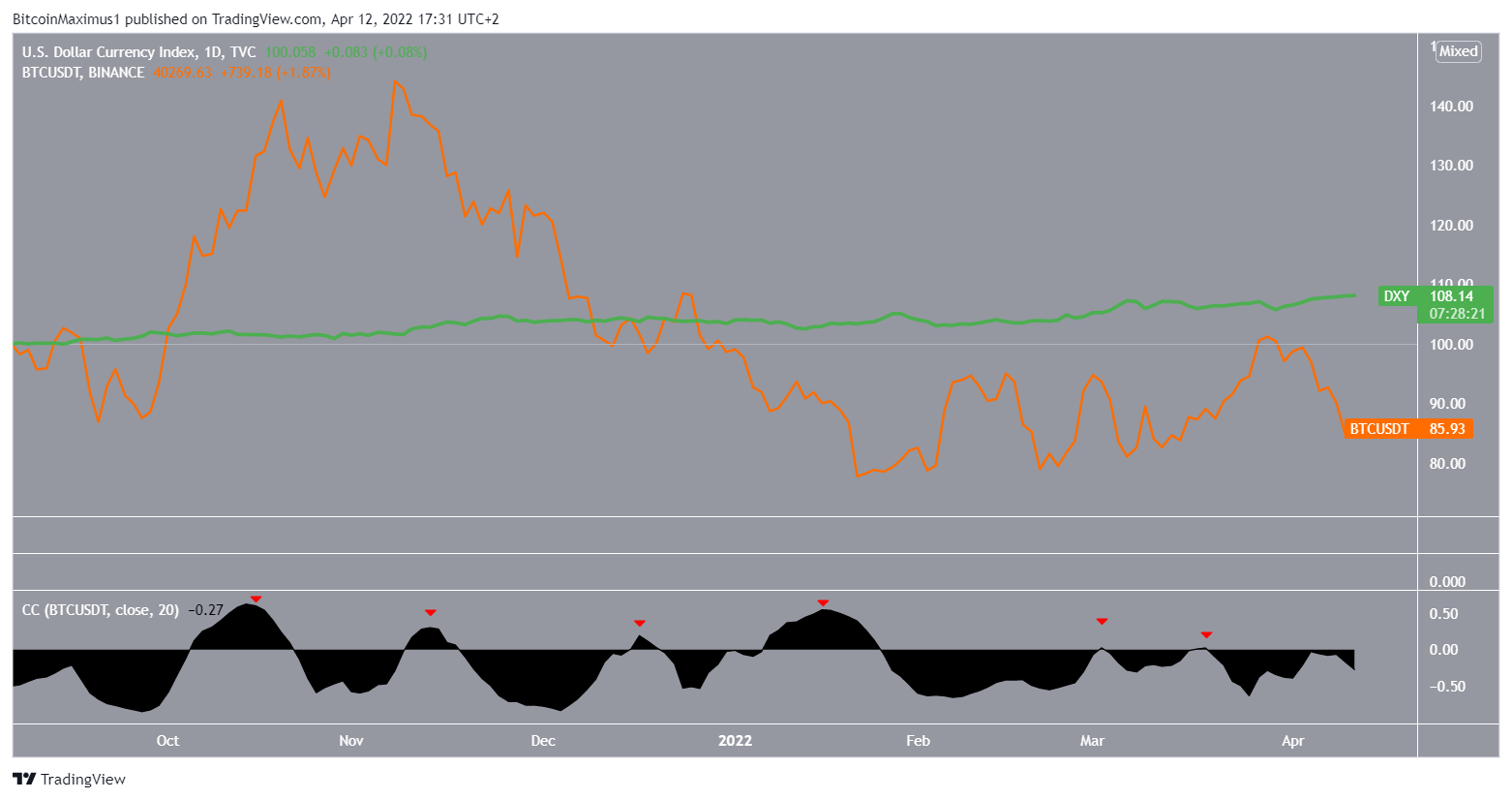 Ao comparar o movimento do DXY (verde) com o do BTC (laranja) há uma correlação predominantemente negativa. Desde outubro de 2021, há seis períodos (ícones vermelhos) nos quais a correlação se tornou brevemente positiva.