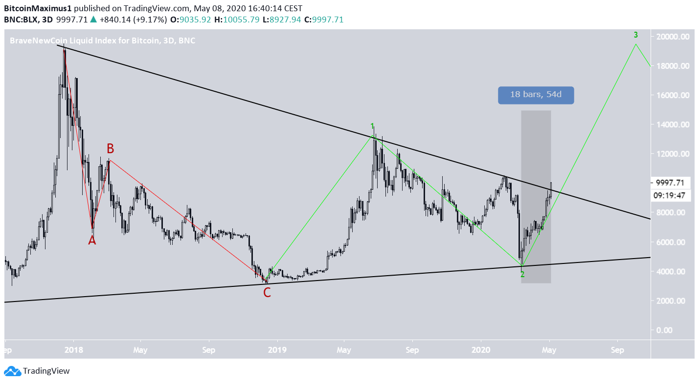 A possibilidade mais otimista sugere que a correção A-B-C foi concluída em dezembro de 2018, com a mínima de US $ 3.300. Desde então, o preço iniciou uma nova formação Elliott de cinco ondas, na qual a Onda 2 terminou com as mínimos de 13 de março de 2020. Portanto, o movimento atual faz parte da terceira onda maior, que, ao julgar pela duração da primeira, provavelmente continuará por algum tempo.