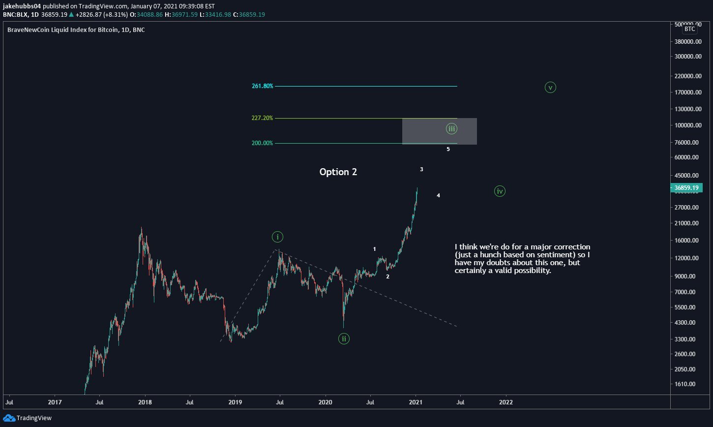 Devido ao formato do movimento do preço, o que parece certo é que o BTC está na onda do ciclo 3 (mostrada em vermelho abaixo). Ele completou as ondas do ciclo 1-2 após a mínima de $ 3.122 em dezembro de 2018 e começou a onda do ciclo 3 em março de 2020.