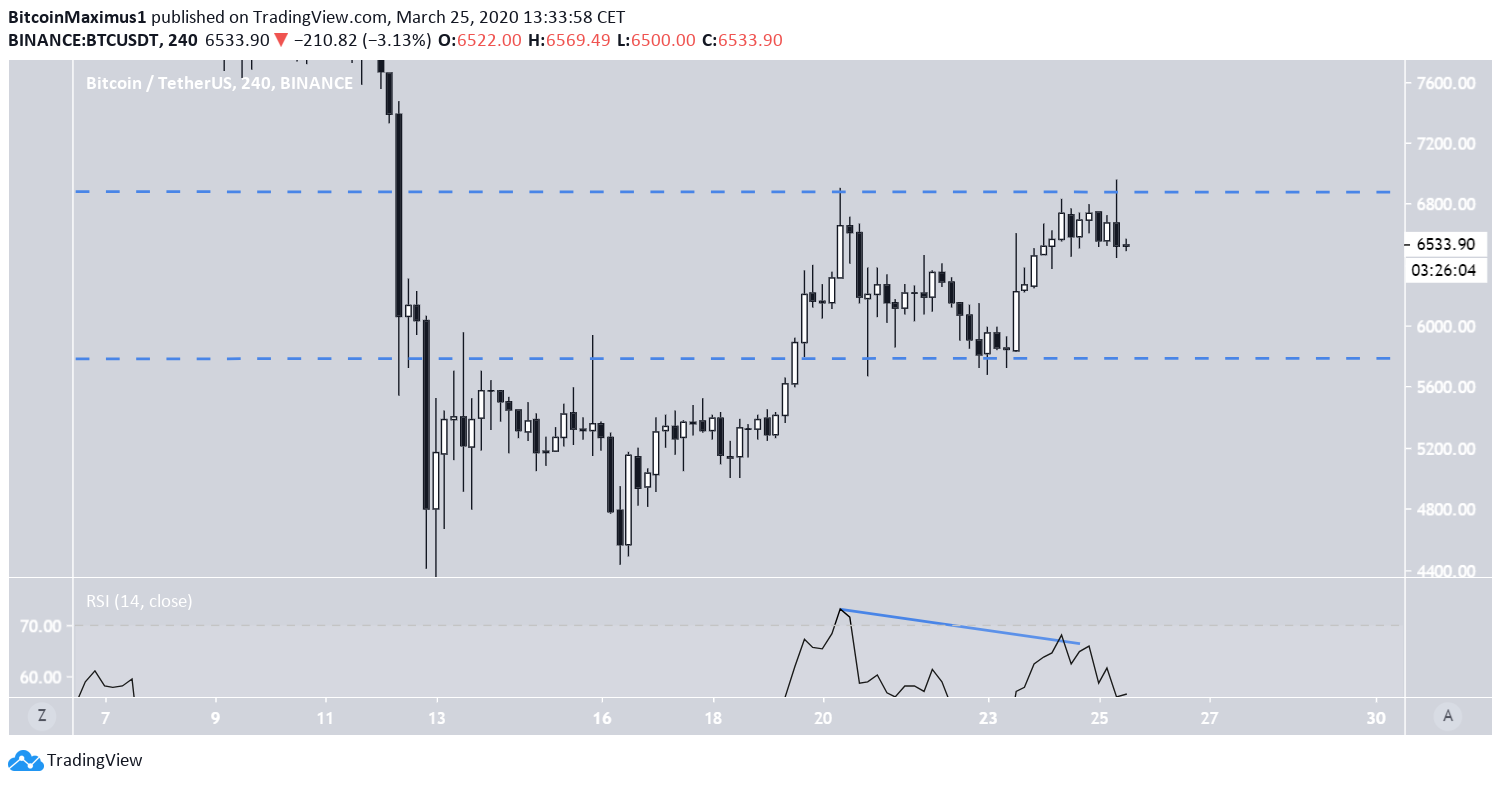 Desde 19 de março, o preço completou um topo duplo próximo a US $ 6.850, o que é considerado um padrão de reversão de baixa. Além disso, é combinado com uma divergência de baixa significativa no RSI, um sinal de que o preço provavelmente cairá para o nível de suporte e possivelmente ainda mais abaixo.