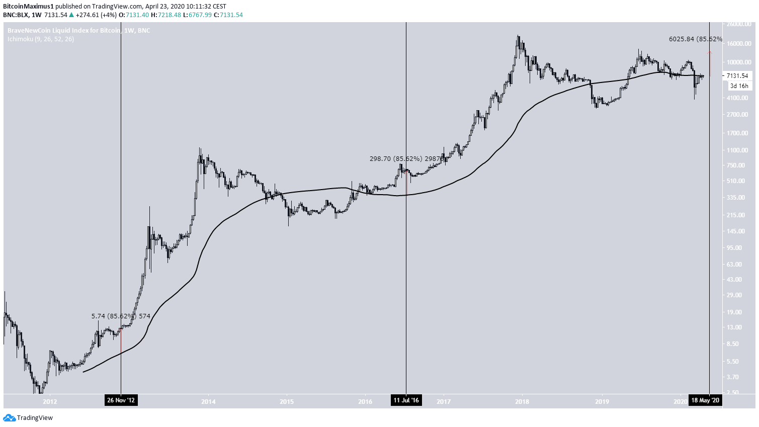 No movimento atual, a máxima mais recente foi a de US $ 10.504 alcançada em 7 de fevereiro de 2020. Se o halving ocorrer em 12 de maio, a máxima seria 98 dias antes do evento.