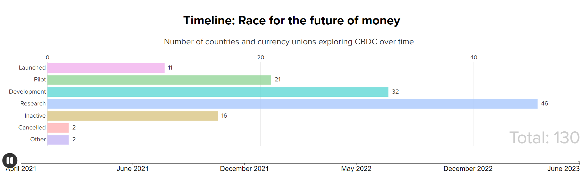 Atualmente, 130 países, representam 98% do PIB global, estão explorando a CBDC, incluindo o Brasil. Em maio de 2020, apenas 35 países consideravam uma moeda digital própria. O gráfico abaixo foi chamado de A corrida do futuro do dinheiro.