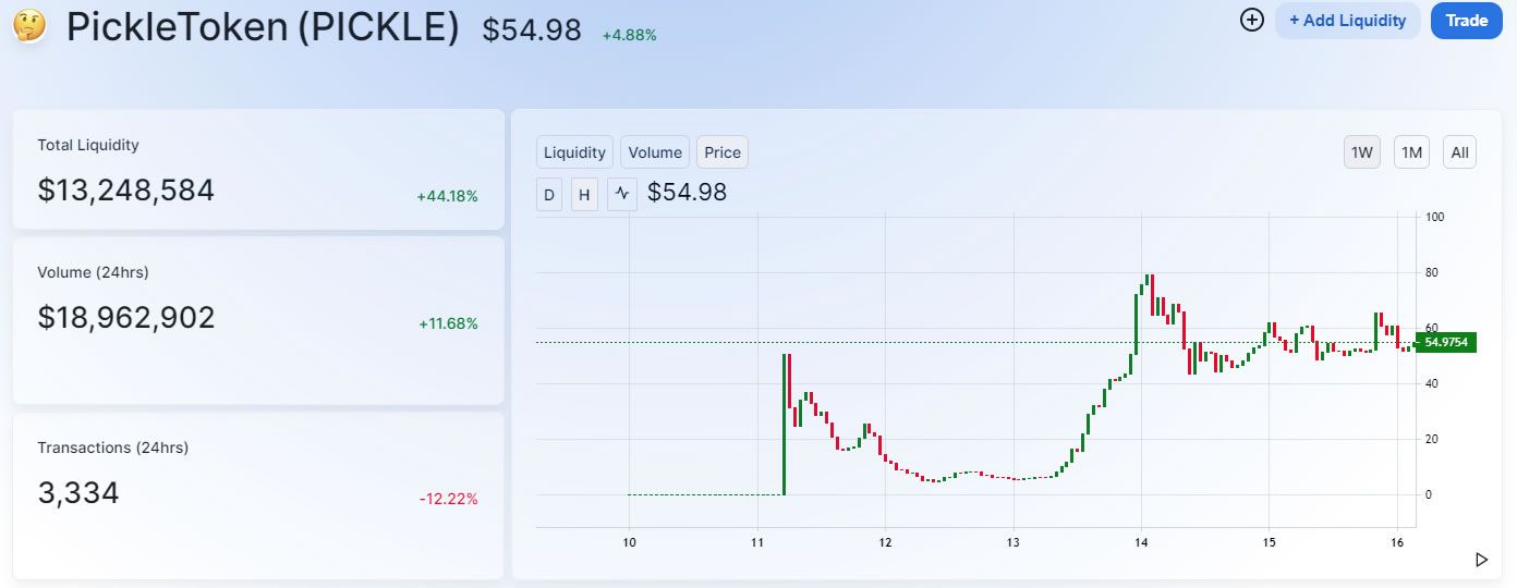 Até o momento, os tokens PICKLE eram negociados a US $ 55, de acordo com o Uniswap. Três dias depois de seu lançamento, o token atingiu a máxima de US $ 80 antes de voltar aos níveis atuais.