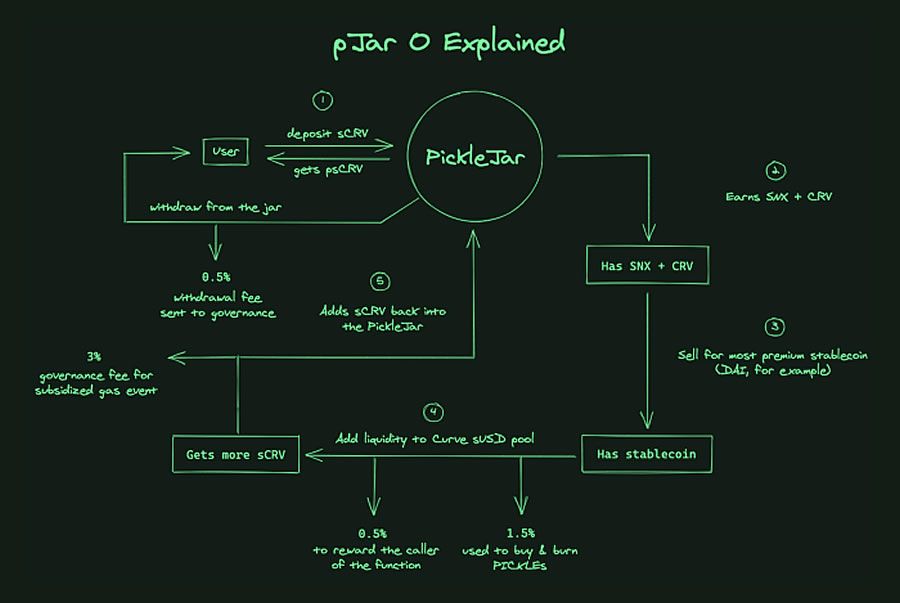 A estrutura de taxas aloca 3% para governança para taxa Gas subsidiada, 0,5% para o chamador da função como uma recompensa por acionar a estratégia, 1,5% é usado para comprar e queimar tokens PICKLE do mercado e há uma taxa de retirada de 0,5%.