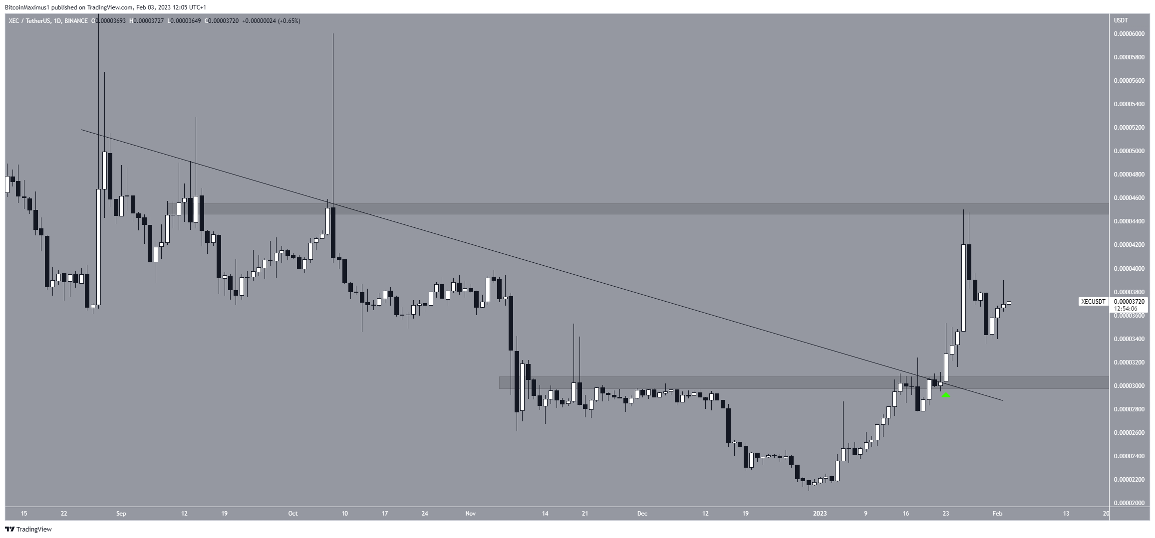 Em 22 de janeiro, o XEC saiu de uma linha de resistência descendente, atingindo uma alta de US$ 0,000045 quatro dias depois. Ele foi rejeitado da área de resistência de US$ 0,000045 no mesmo dia e criou um longo pavio inferior. Se o movimento descendente continuar, a área de suporte mais próxima seria de US$ 0,000032.
