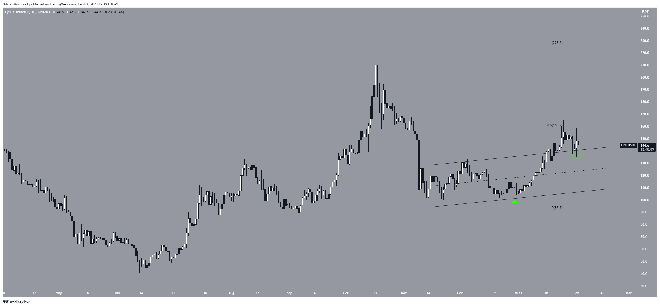 A QNT subiu desde 15 de novembro. Em 28 de dezembro, saltou na linha de suporte de um canal paralelo ascendente (ícone verde). Em seguida, saiu do canal em 20 de janeiro. Atualmente, a QNT está tentando validar a linha de resistência do canal como suporte (círculo verde).