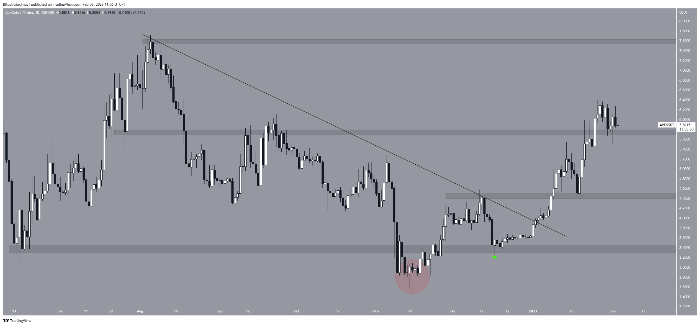 Em seguida, a APE saiu de uma linha de resistência descendente e recuperou os níveis de resistência de US$ 4,45 e US$ 5,75. Atualmente, a altcoin está tentando se manter acima da área de suporte horizontal de US$ 5,75. Se for bem-sucedida, a próxima resistência será de US$ 7,60.
