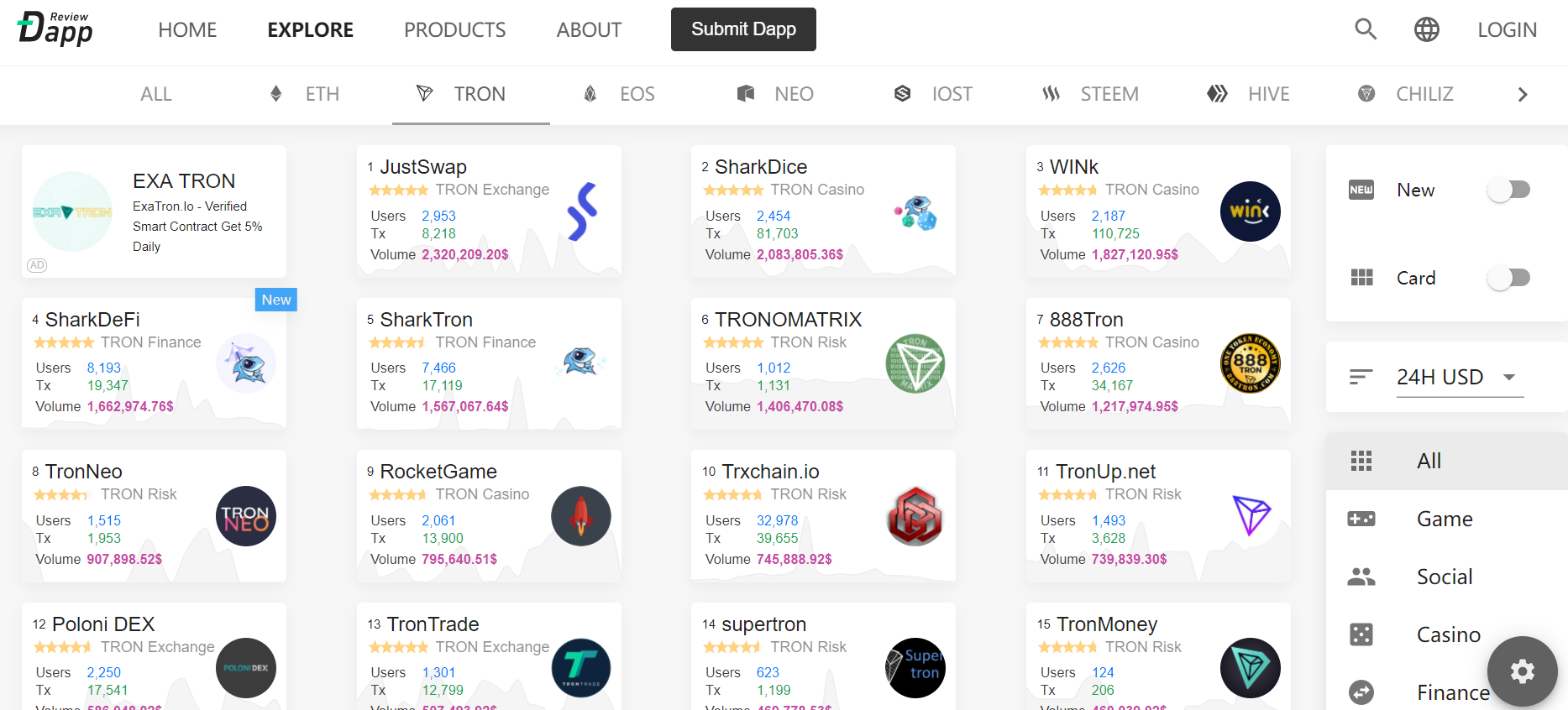 Em busca do melhor que o Tron tinha a oferecer em termos de DeFi, acabei acessando o Dapp.review . O site lista e classifica diferentes aplicativos descentralizados por uso pretendido, protocolo, bem como várias métricas.