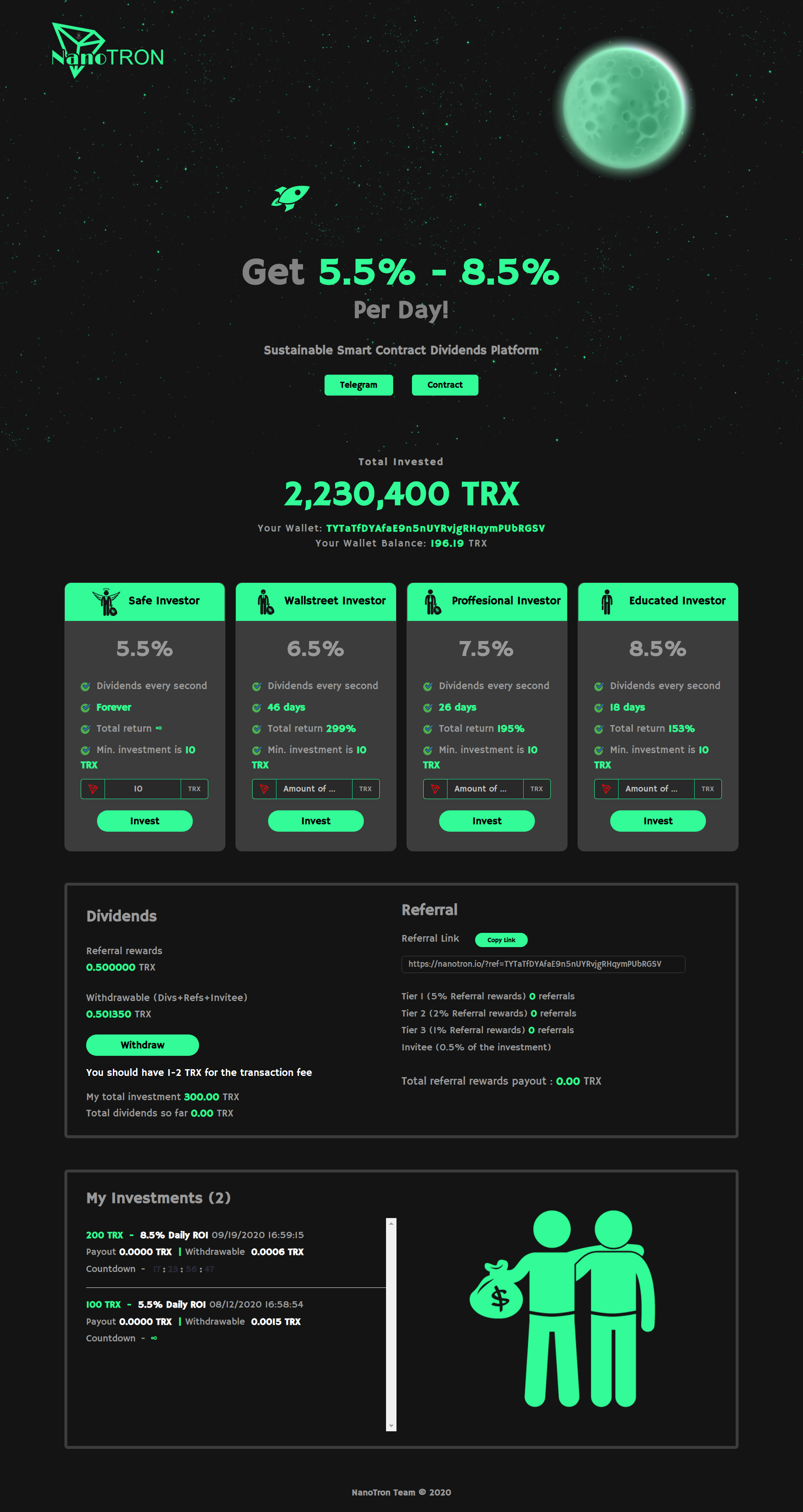 A página de destino fornecia várias opções de investimento que pareciam fora deste mundo. A Nanotron ofereceu 8,5% de juros diários sobre a aposta da TRX por 18 dias, totalizando 153% de juros. Outra opção oferecia 5,5% de juros diários sem limite. Isso era bom demais para ser verdade? Quase com certeza! Mas um esquema Ponzi só é ruim se ele se queimar antes de retirar seu dinheiro.